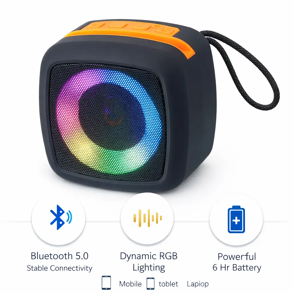 Portable Bluetooth speaker with dynamic LED lights, rechargeable battery, and wireless connectivity — perfect for parties, home, outdoor, and travel use.